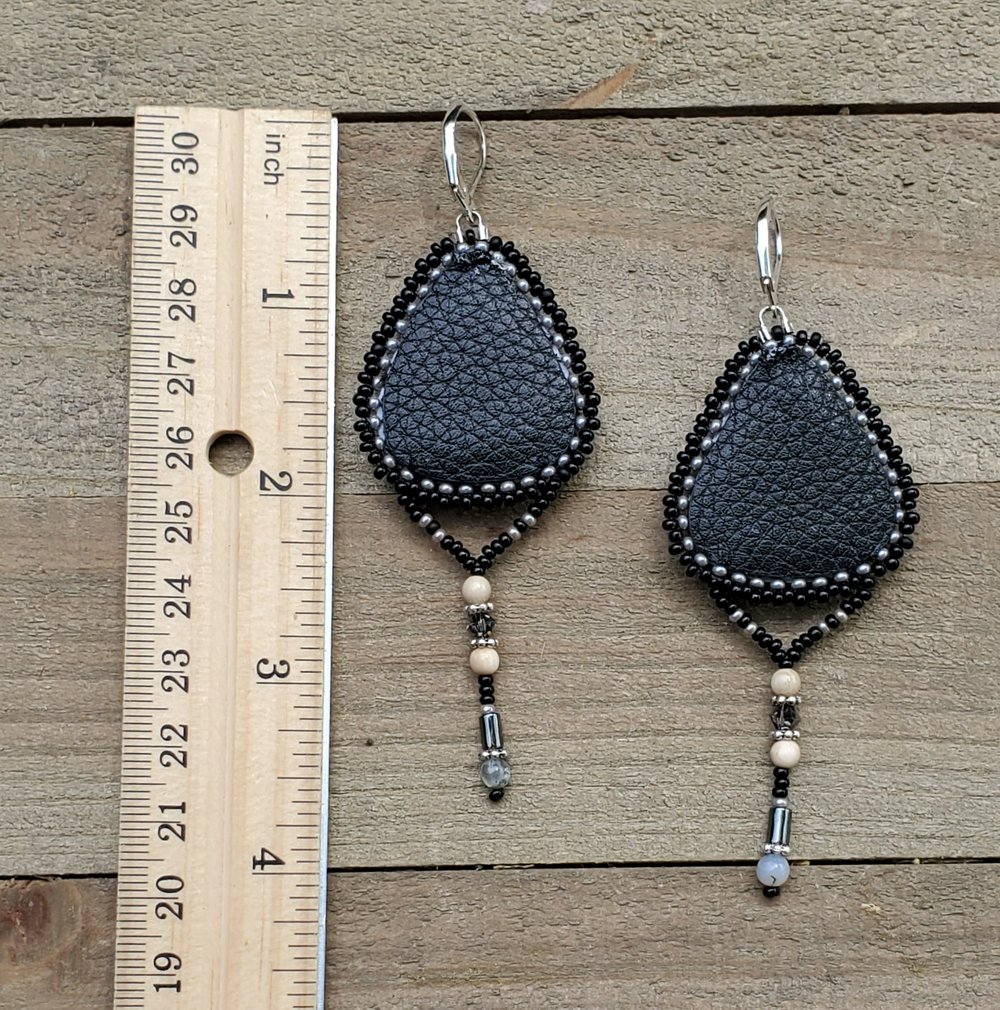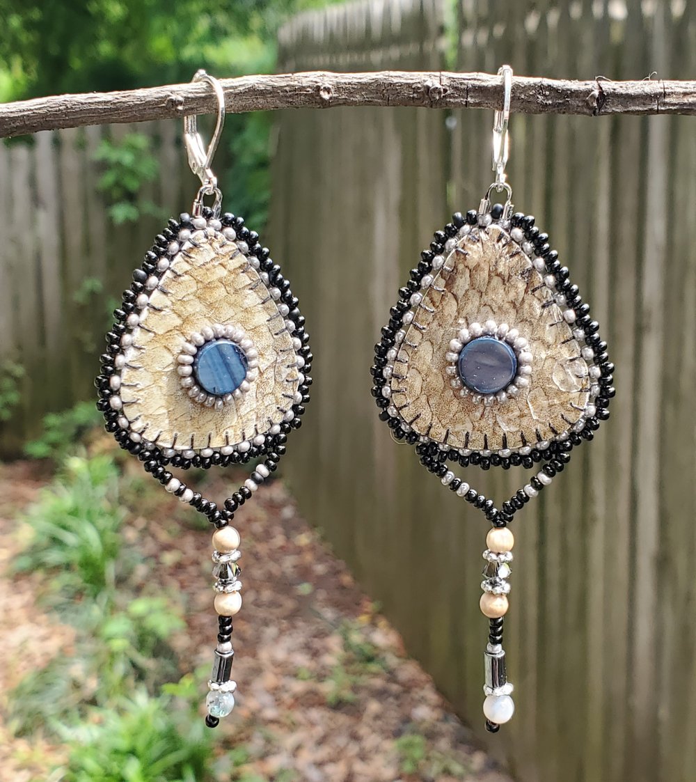 Mammoth & Salmon... Beaded earrings made with wild Alaska sockeye salmon skin I processed and preserved myself by hand, shell centers, genuine prehistoric mammoth ivory, glass beads, Swarovski crystals, jasper, hematite, grain leather backing, and silver-plated hypoallergenic lever-back ear hooks. See ruler in last photo for size.